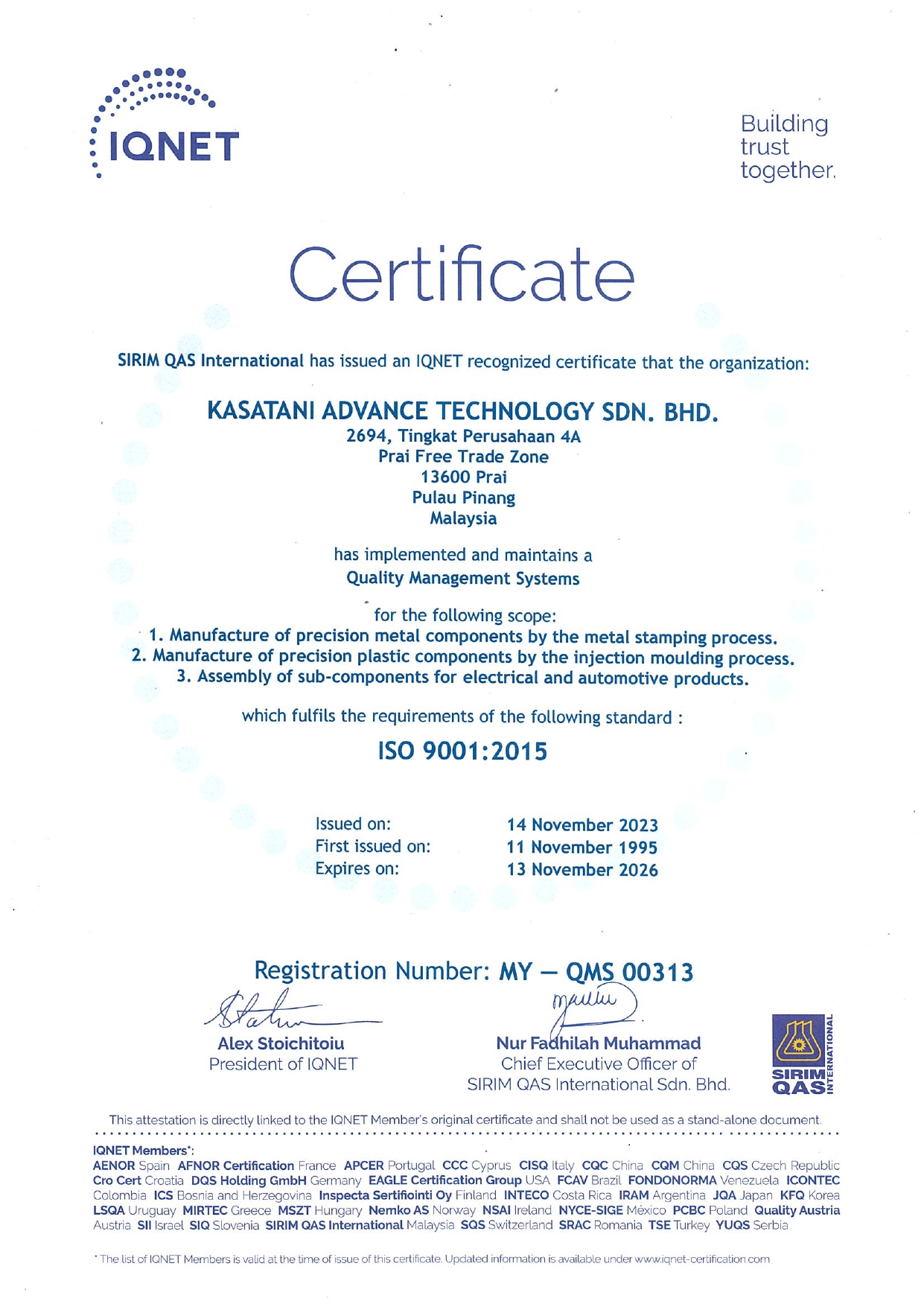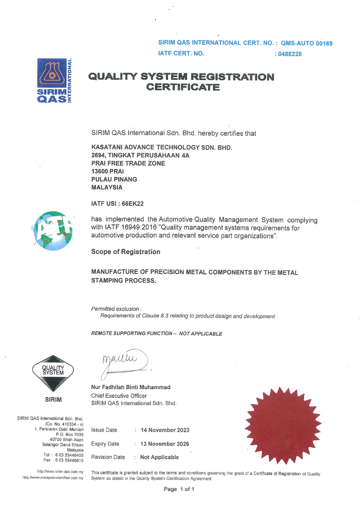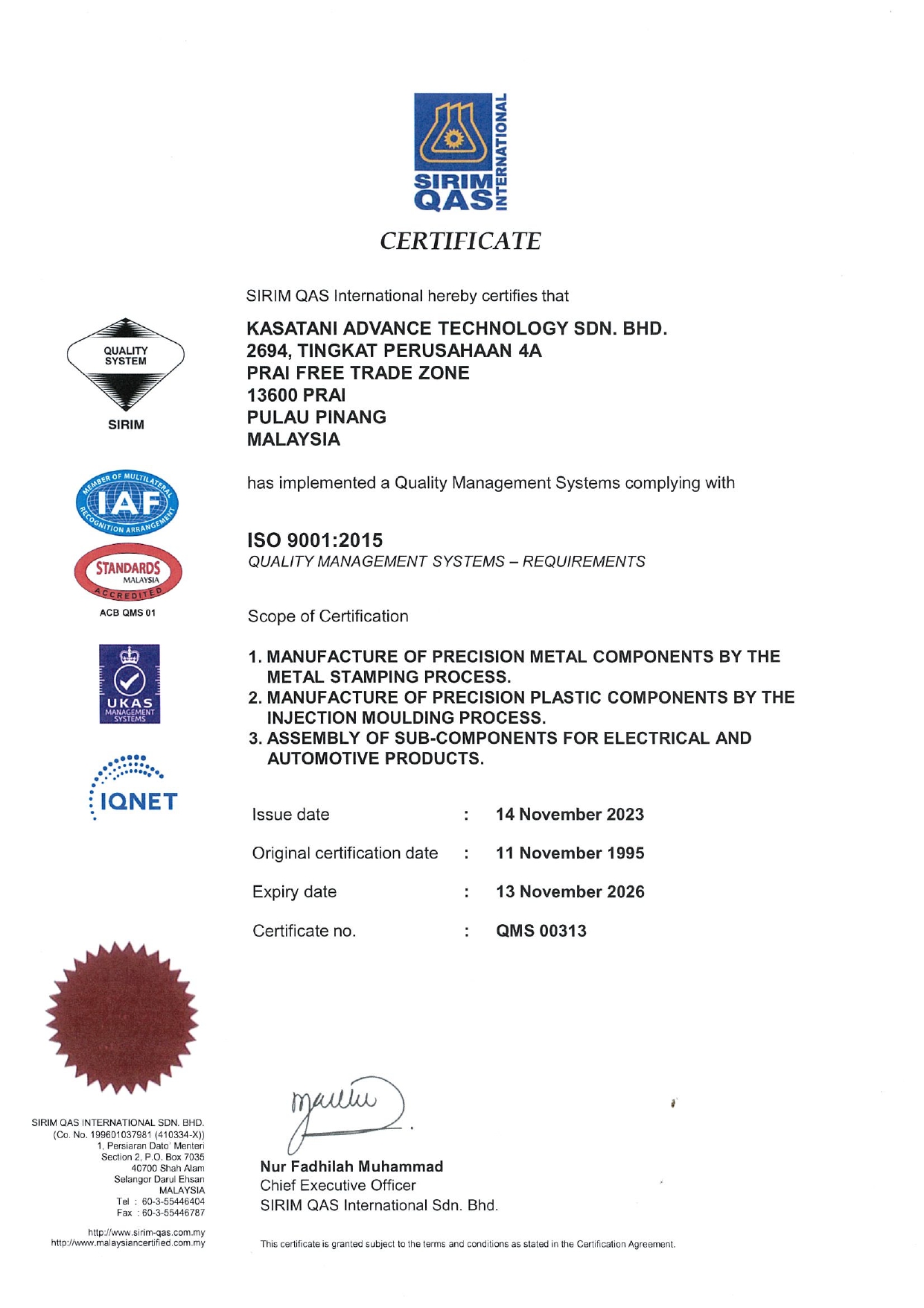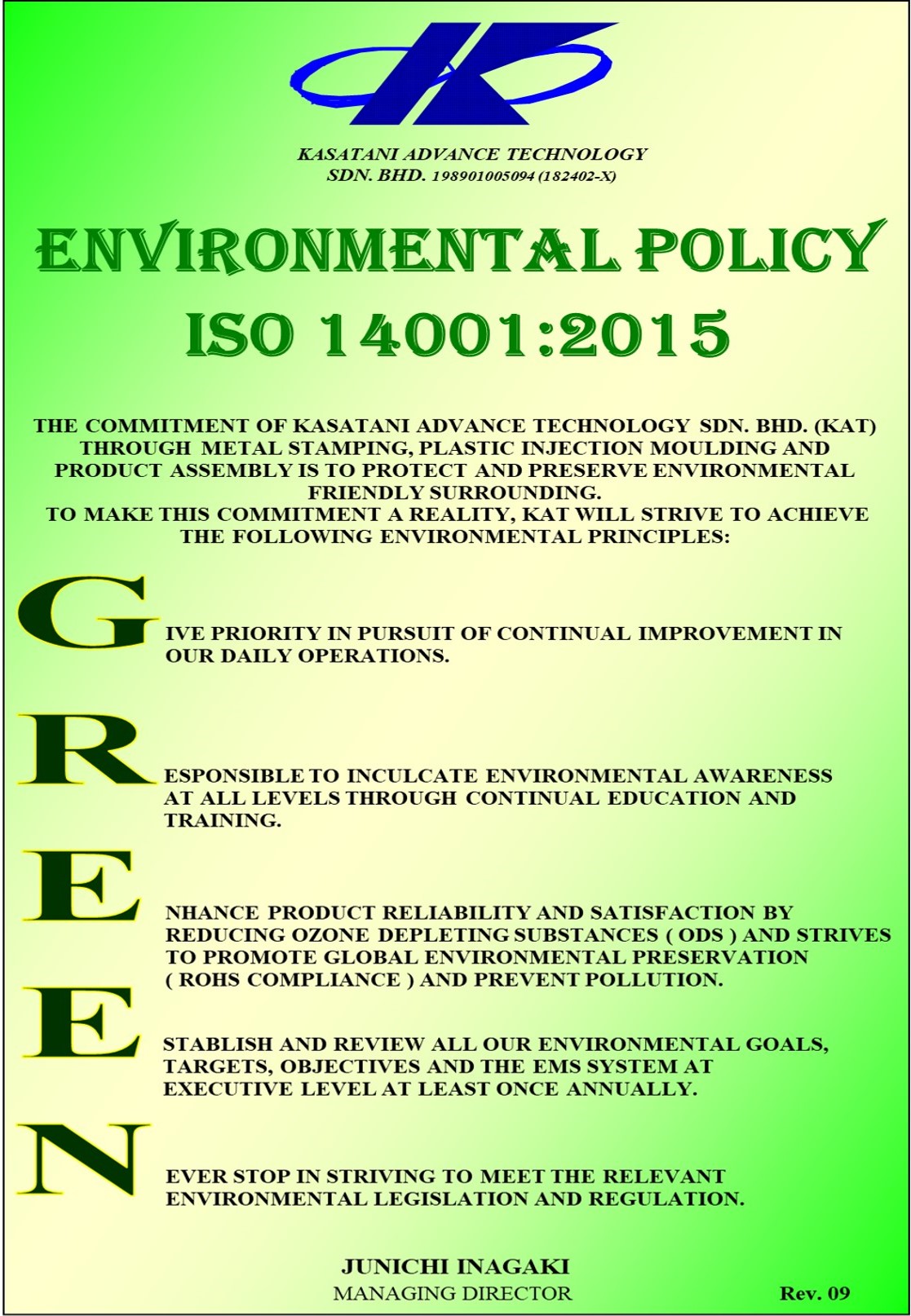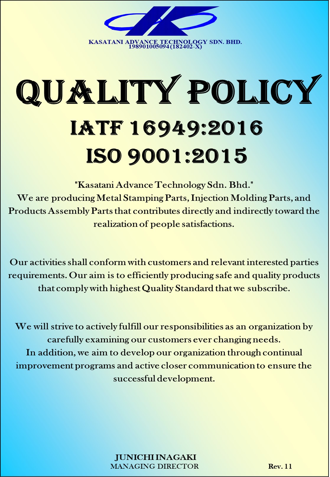 Kasatani Advance Technology Sdn. Bhd. is confident that this Safety & Health Policy will be a symbol of pride for all employees in culturing a safe and health working attitude.