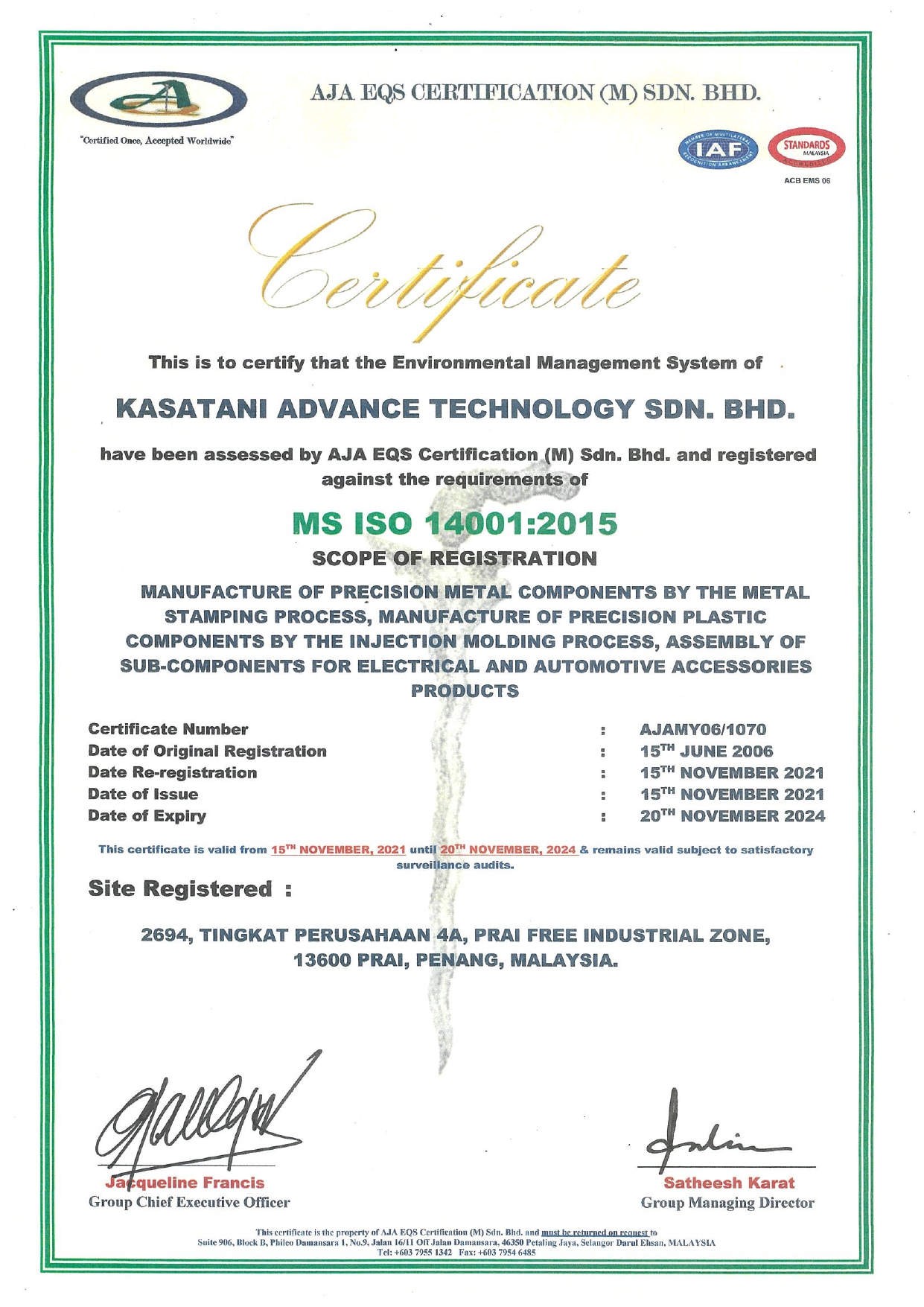 The primary objective of Kasatani Advance Technology Sdn. Bhd. is that, all employees together with the top management, commit to ensure that the Occupational Safety & Health Act 1994 (Act 514) is complied fully, with the intention of promoting safe and healthy working environment.